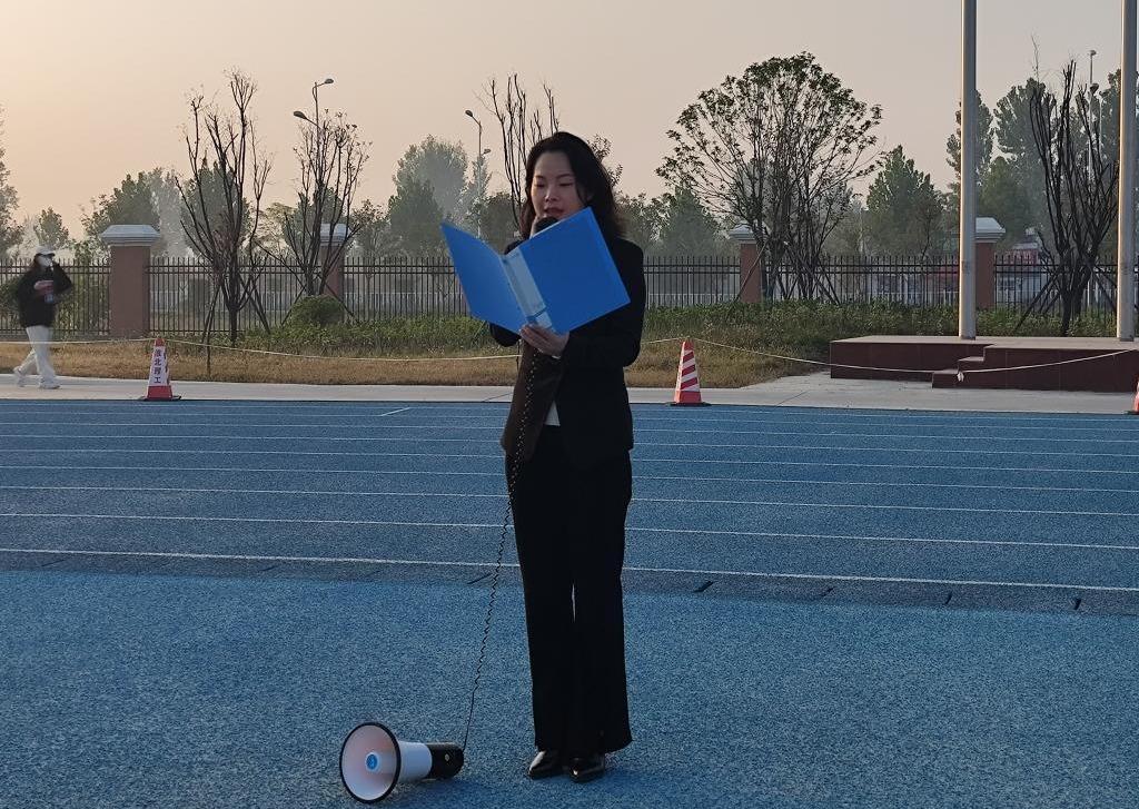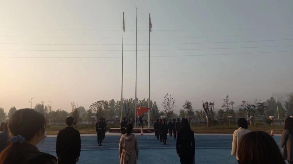 活动伊始,7点15分伴随清晨的阳光,升旗仪式正式开始。全体师生精神饱满,在升旗台前整齐列队。国旗护卫队迈着铿锵有力的步伐护送国旗入场,在全场师生庄严肃穆的注视下,伴随着雄壮的国歌,鲜艳的五星红旗冉冉升起,迎风招展,在金色秋日的映照下“中国红”耀眼夺目,全体师生肃穆而立,向国旗行注目礼。