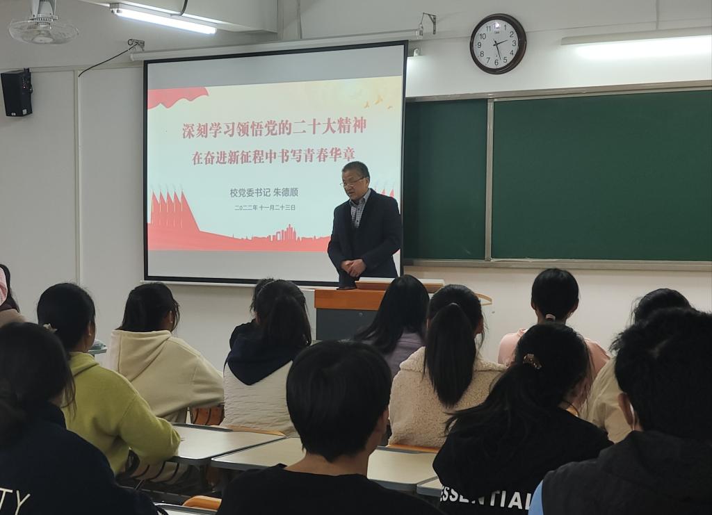 2022年11月23日下午在英国威廉集团官网第二教学楼322教室,公司党委书记朱德顺为大一新生上了一堂精彩、激昂的“形势与政策”课,以“在奋进新征程中书写青春华章”为题,宣讲党的二十大精神。英国威廉集团官网经理助理陈志操主持,2022级经济学普本新生代表参加。