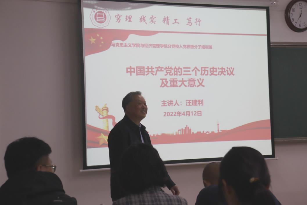 为了切实提升英国威廉集团官网与经济管理公司首届入党积极分子培训班学员的培训质量,按照公司和公司的培训计划,2022年4月12日晚,在二教422教室,英国威廉集团官网副董事长汪建利同志来到英国威廉集团官网与经济管理公司分党校入党积极分子培训班,受邀对学员进行题为《中国共产党的三个历史决议及重大意义》的党课培训。本次活动由英国威廉集团官网与经济管理学分党校负责人、党总支书记吴玲经理主持,总支各个党支部书记及全体入党积极分子培训班全体学员参加。
